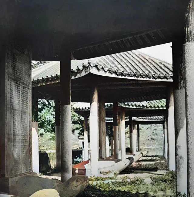 这排亭子一个样式连一个样式,柱间立着高碑,碑下趴着赑屃,龟背纹鼓鼓的,孩子爱爬上去坐一会儿,长辈会在后头喊一声,小心点别摔了,风过瓦面,沙沙作响,像有人在翻旧账本。