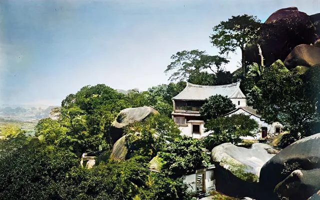 屋脊压在巨石与树影之间,台阶顺着山势上去,墙白瓦灰,院里凉气十足,站在檐下往外看,田野像被轻烟罩着,远山一层一层往后退。