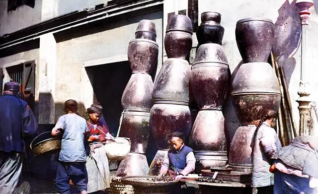 这几口紫褐色的大缸可扎眼,口沿厚,肚子鼓,码成一堵墙,孩子凑过去能在釉面上照个影儿,老板娘坐在矮凳上理账,旁边的伙计端着箩筐过秤,酱菜的香气顺着巷子往外飘。