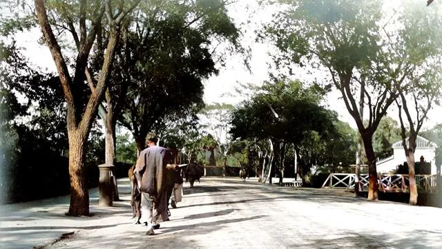 这条路叫静安寺路,那时的树就这么粗,枝叶搭成伞,阳光被切成碎片撒在路面,人走在树影里不着急,租界房子退后一点,白栏杆沿着马路压着线,如今名字换成南京西路了,车比人还多。