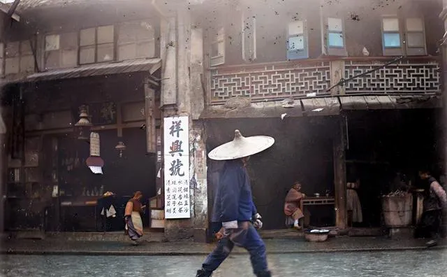这个门口挂着“祥兴号”的牌子,地上水光一片,一名戴斗笠的男子快步从雨帘里钻过,斗笠像一只倒扣的大碗,檐角的雨线往下滴,店堂里有人端着碗吹气,热气把窗纸都熏得白。