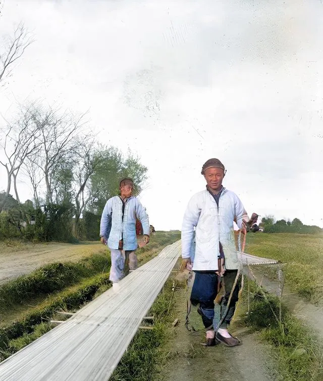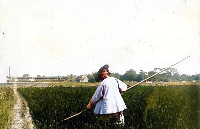 这人背着长杆,脚踩在泥里,胳膊一摆就把杂草挑开了,远处烟囱竖着,厂里的汽笛一响,田里的人抬头望一眼又低头干活,那会儿的夏天,衣衫被汗水一遍遍浸透。