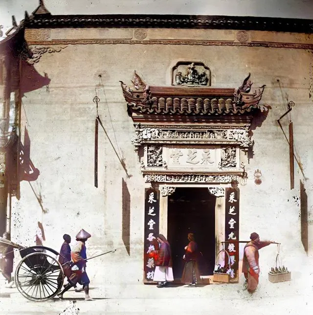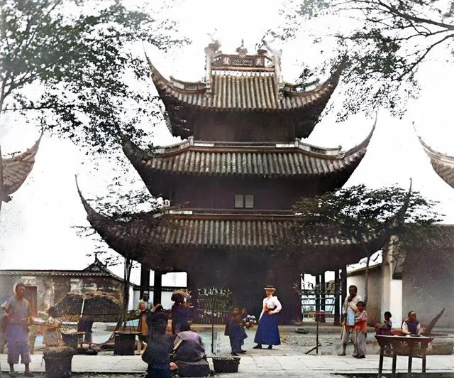 这座三层的鼓楼翘角飞檐,塔影压在院子里,人群里有挑担卖点心的,也有牵着孩子在树下歇脚的,外地来的洋人站在阴影边上看得入神,寺门外烧香的烟一路缭绕到屋脊。