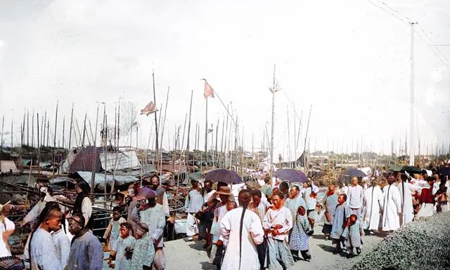 这个画面挤满了人,孩子牵着大人的袖口,撑伞的妇人绕开摊贩,远处桅杆像森林一样立着,江风夹着河腥味往人群里送,热闹不比现在少。
