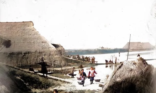 这段岸线被人脚踏得发亮,挑担的人来来回回,妇人蹲在水边洗衣,孩子在泥地里追着跑,河对岸的土堆像小山,天色一暗,大家就拾掇家伙往回走。