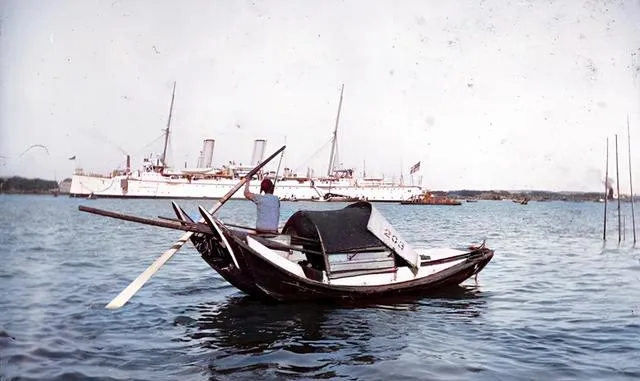 这艘小客船顶着黑篷在江心晃,远处的白色巨轮汽笛一鸣,水面抖了两下,船工把桨横过来,等浪过去再划开,近景远景凑在一起,就能看出那会儿上海的尺度。