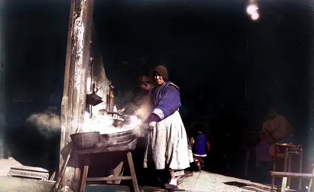 这个店里主卖热水,黑铁炉一排排,壶嘴往外喷着白气,女人拎着提梁壶,手背被蒸汽一烫往回缩一下,那时候没热水器,街角这口热就是生活的温度。