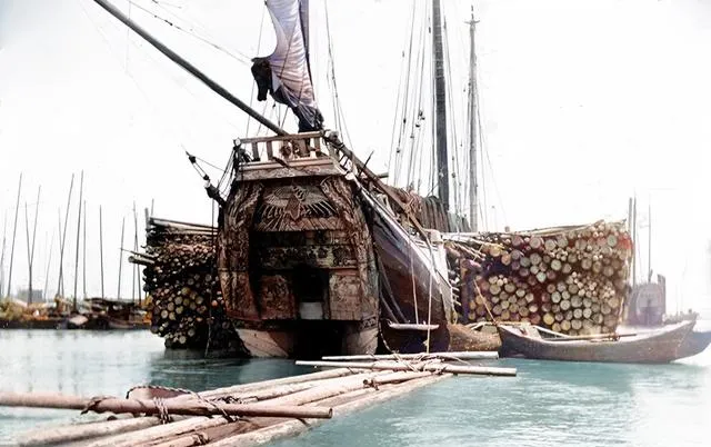 这艘大帆船专拉原木,船舷两边捆得鼓鼓囊囊,船尾雕花还在,漆色却被盐风磨掉了,水工踩着木跳板过去,用长篙试水深,等潮水抬高一点就解缆。
