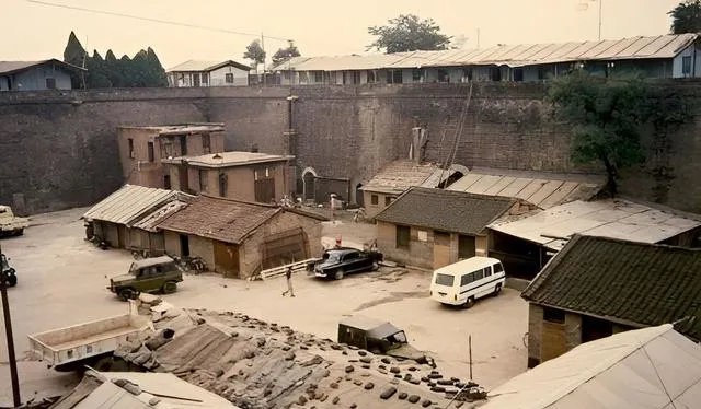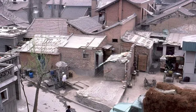 图里是城墙脚下的小院,砖房瓦顶层层叠叠,门口靠着独轮车,牛草垛堆在墙边,雨过地上留着车辙,老邻居端着铝盆走过,跟你打个招呼就进门了。