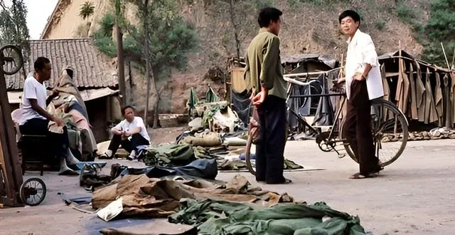 图中这一片是旧货摊位,帐篷布、军被、衣料铺开在地上,旁边靠着一辆大梁自行车,摊主叼着烟卷和人砍价,一手提起布料“哗啦”一抖,光线斑驳地落下来,便宜实在用得住。