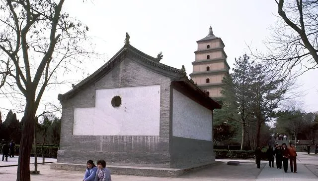 图中砖墙灰瓦,背后探出大雁塔的一截,树影被风拉长在地上,两个姑娘坐石凳上聊天,空地宽宽的,没什么人走动,和现在的热闹完全不一样。