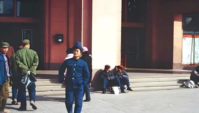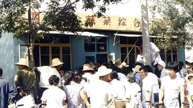这家副食蔬菜综合商店门口,人围了好几层,手里提着篮子和搪瓷桶,售货员隔着窗口往外递,一会儿就有人扛着大白菜走了,脚边落了一两片菜叶子,绿得好看。