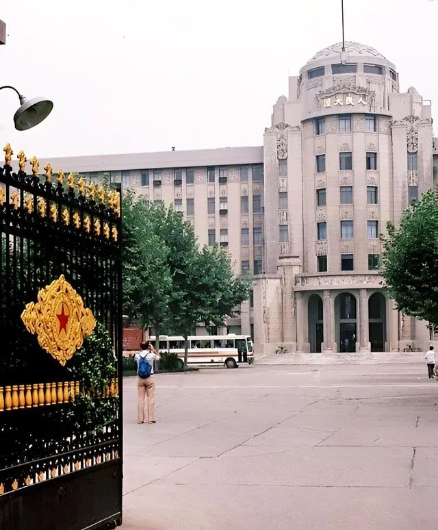 图中这栋是人民大厦,中西合璧的外立面挺讲究,圆顶和立柱把气势撑起来,院门的栅栏黑金配色,保安站在门边一动不动,公交车从里面缓缓开出来。