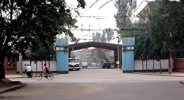 图里的蓝色大门立柱醒目,电车从厂区里缓缓开出,车身擦得锃亮,师傅把头探出来招呼一声,旁边骑车的人立刻让出道来,那会儿大家彼此都懂。