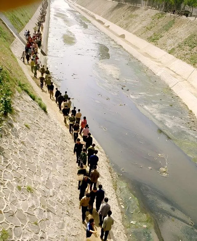 这条长龙一样的队伍沿着河走,肩上扛着工具,扫帚和铁锹一晃一晃,水面映着灰白的天色,口号喊得不响,可脚步齐齐的,很快就把沟渠清出来了。