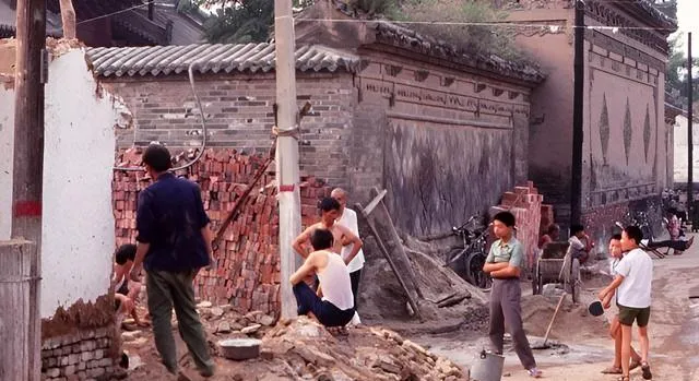 这个角落里师傅们在砌墙,小孩蹲在旁边看着玩,砖一块块码齐,石灰水在桶里咕嘟,汗从额头上往下淌,抬头一看,墙上的影子已经移到另一边了。