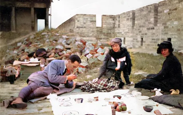 几位外乡人铺着白布,碗盘摆开,背后城砖乱成堆,风把纸角吹得直抖,壶里倒出来的是热汤还是咖啡不得而知,旅人到哪儿都要吃吃喝喝,这就是本事。