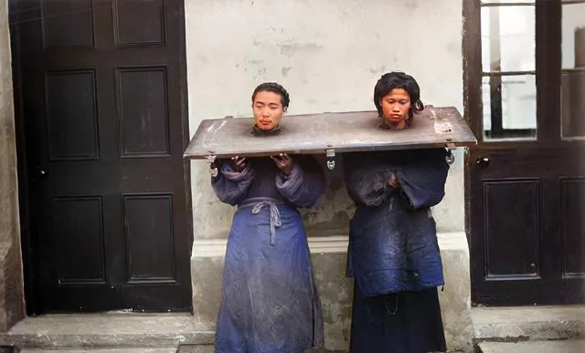两人被一块大木板压着肩颈,脸上灰扑扑,脚步移动得很慢,门扇冷不丁一响把人吓一跳,街角有人围看,眼神里既好奇也怕事。
