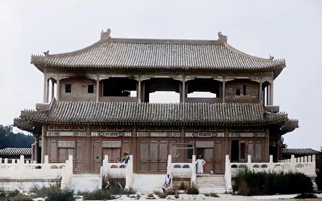 图中这座两层歇山顶的殿宇,木作粗壮、檐牙高挑,台基前的汉白玉栏板被风沙打磨得发灰,门扇上还留着雕花的暗纹,别看空空荡荡的,这种规制一摆出来,场面立住了。