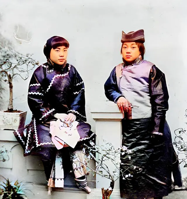 左边裙袂层叠、鞋尖微翘,右边立领短褂、帽子压额,两个姑娘并肩而立,一个温柔一个干练,摆造型的手劲儿都不一样,摄影师肯定在旁边说,别动,就这样。