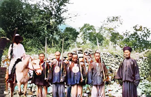 这个队列简单利落,枪杆子高过肩,骑白马的领头人把缰绳握在掌心,旁边官员按着袖口,石墙后面是青树成行,地方团练就是这样,农忙耕地,闲时练阵。