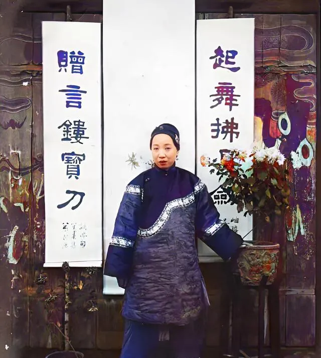 这个合影很讲究站位,方几上搁花瓶与纸镇,小姐披浅色披风,手里捏着折扇,身旁的小丫头袖口宽大、眼神拘谨,衣料一厚一薄一软一硬,身份在衣角缝里就露出来了。