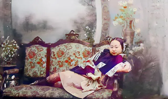 这个姿态很讲究,胳膊肘搁在软垫上,眼角挑着笑,袖口的滚边层层叠叠,沙发纹样密不透风,像是刚从书页里抬头,问你看没看见她的新钗子。