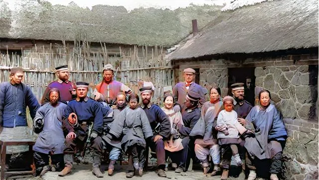 这一排人凳子坐得挤,衣料颜色从暗蓝到赭红,脸上的表情各不相同,门槛处堆着柴草,院墙是碎石砌的,这样的合影没台词,却能感到风向在变。