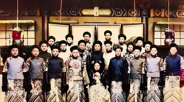 这个大合照衣料统一,发髻稳稳端着,背后屏风与灯笼把空间压低,站在中间的小个子目光直直,队形像排好的纹理,礼制讲究在此刻一览无余。