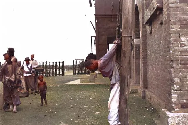这个姿势看着就疼,木桩斜着压在肩,脚下土屑粘着腿,旁边路人经过也不多看一眼,冷风顺墙吹过,那种没处可躲的难堪从画里透出来。