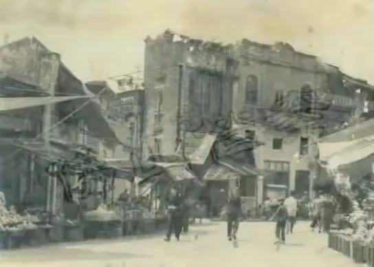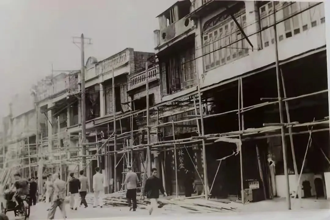 永安路位于禅城区,1931年,佛山扩建马路时,将永安上街、永安下街、正埠码头等多条老街巷合并,正式命名为永安路。 咏春拳大师叶问于1941-1943年间开设拳馆授徒的地方,是咏春拳发展史上的重要地点。照片上的永安路,人来人往非常热闹。马路两边都是骑楼式建筑,前面右边的房屋搭着棚架,正在装修。