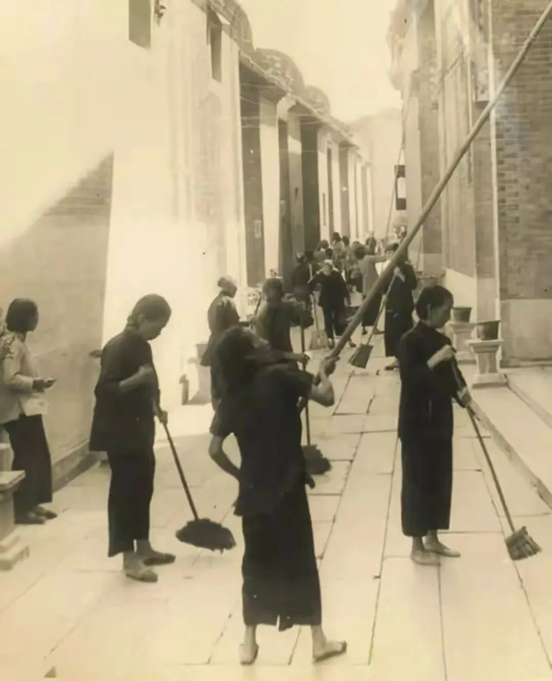 东华里的妇女们个个拿着扫把,正在进行大扫除。