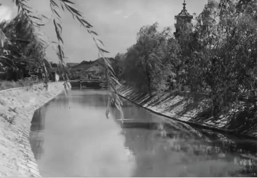 50年代的中山路和汾江河,河的近处有两间瓦房,种了不少树木。远处的另个一边,一排的居民楼,有瓦房,也有楼房。河里水很深,两都停着不少的木船。