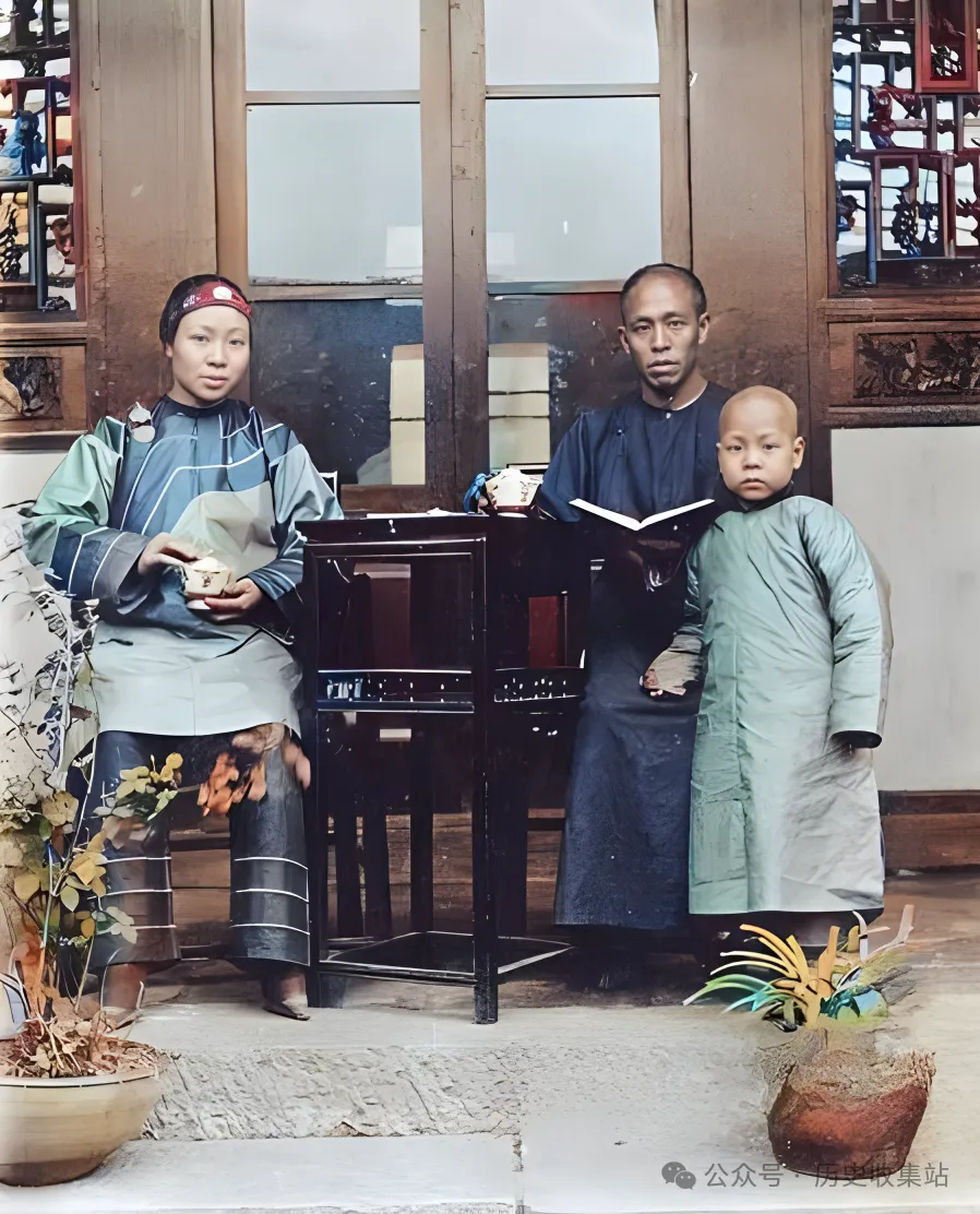 清末,湖南永州的一家三口留下了一张珍贵的合影。从照片的背景和家庭成员的着装可以看出,这个家庭的经济状况颇为优渥。女主人身着时尚的袄裤,虽遵循传统缠足习俗,但服饰已明显受到上海等地摩登风潮影响 —— 夹袄的立领较清初降低一寸,袖口采用西式窄袖设计,马面裙的褶裥数量从十二幅减为八幅,这些细节均体现了晚清服饰 "新旧杂糅" 的时代特征。