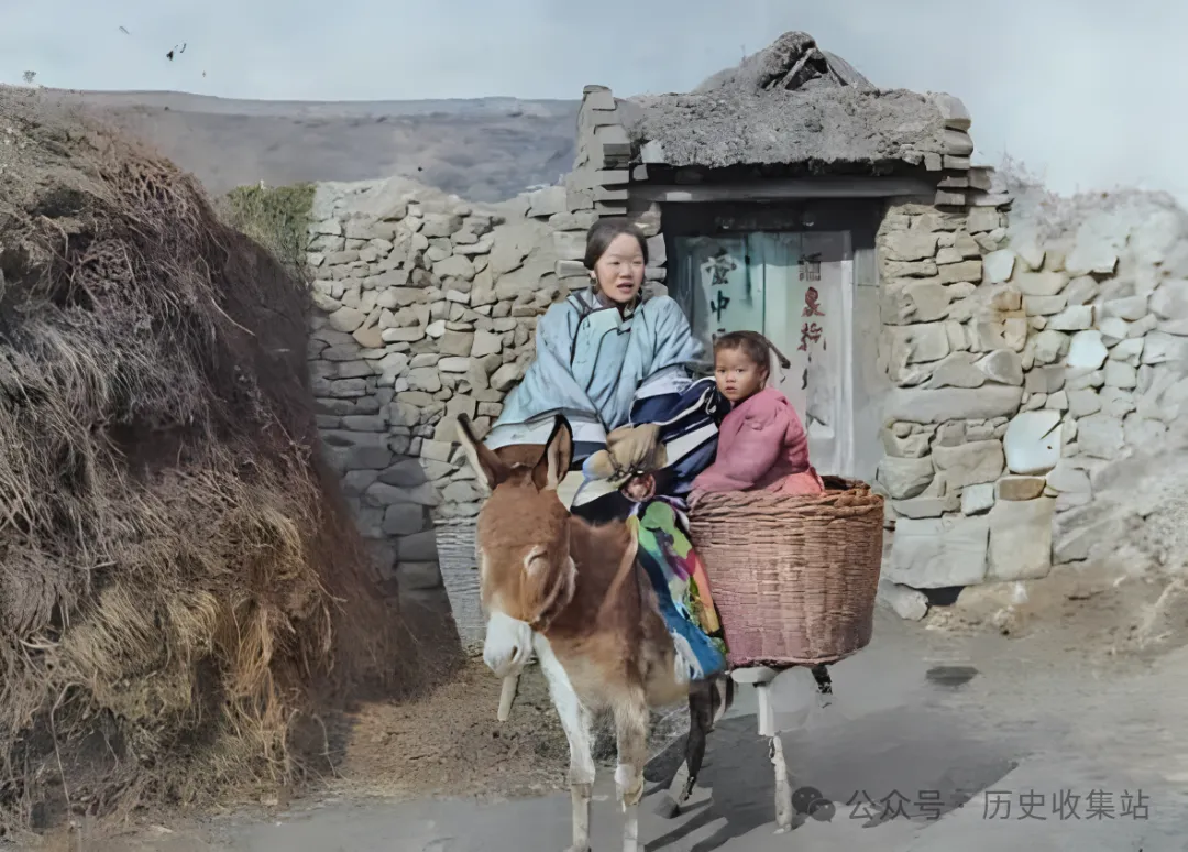 母亲稳稳地骑着驴,女儿则坐在驴背上的竹筐里,辫子扎得整齐,脸上洋溢着回家的喜悦。虽然她们能骑着毛驴出门,看似家境不错,但身后那座简陋的茅草房和石头门却暴露了她们的真实生活状况。