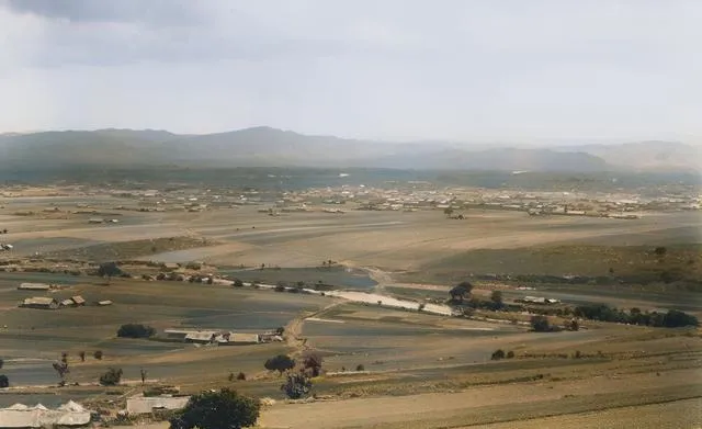 图中这一片开阔的坡地一路铺到天边,零散的房舍像点在宣纸上的墨点,土路弯弯绕到村口,远处青山叠了好几层,爷爷说那时候城外“地比天宽”,春忙一到,马拉着铁耙走一道又一道,尘土里有新麦芽的气味,现在站在高楼上望出去是灯火连成河,以前只有风吹过田垄的沙沙声。