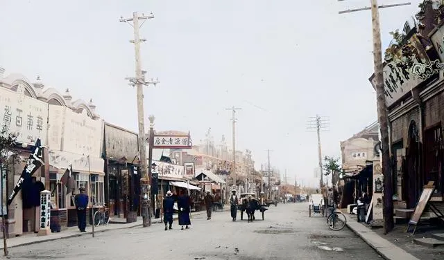 这条笔直的大街好敞亮,两边挂满了招牌,木柱子立着电线杆,车辙压出浅浅的沟,行人不多,却都不忙不慌,那个骑车的人从镜头边掠过去,像从另一个时代踩来了个响铃,现在商铺玻璃一换一,曾经的门脸讲究的是牌匾上的字儿好看。