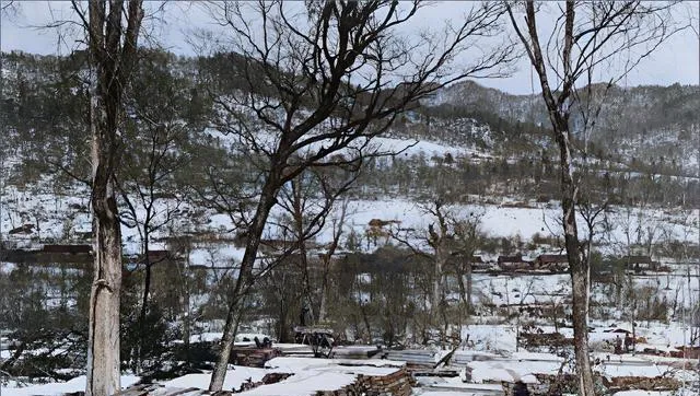 这张一看就冷,树杆子直挺挺立着,屋檐压着厚雪,空地上码着方方正正的木料,像等着上学的孩子排队,风从山坡上卷下来,雪面“嘶嘶”响,照片里没声音,我却好像听见了。