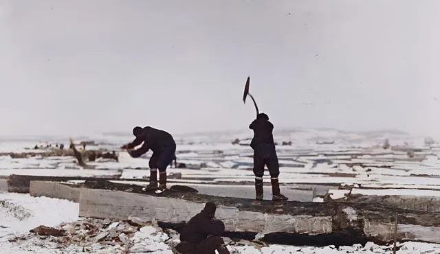 几个人对着一根大圆木下力,铁镐举起来又落下,木茬子四下散开,冷风把汗气都吹成白雾,脚下是结硬的雪面,站不稳就用脚跟抠住冰。