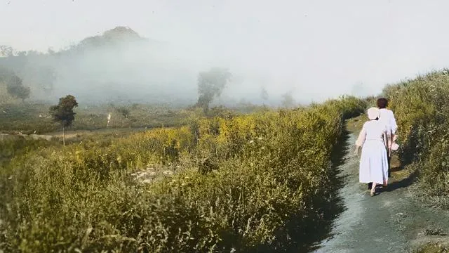 这条小路被雾吞到一半,路边杂草长得过腰,前头两个人拎着东西往里走,像闯进一本没翻完的画册,雾散之前谁也不知道下一页是什么。