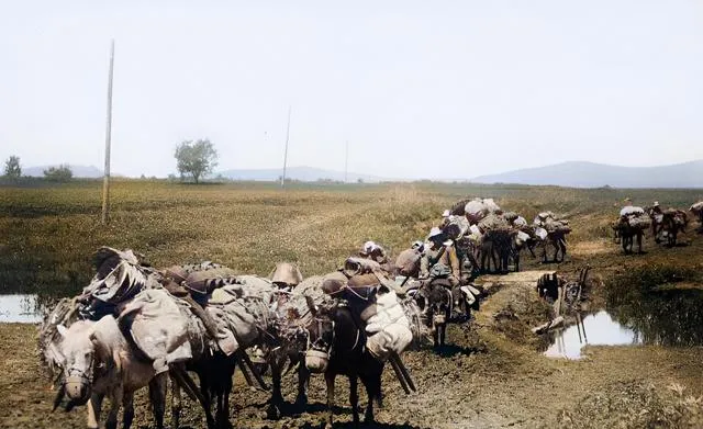 一队马帮沿着湿地边走,马背上鼓鼓囊囊,赶马人把鞭子搭在肩头,脚下的水坑映出天光,谁也不说话,只顾着往前挪,这样的路得靠耐心走出来。