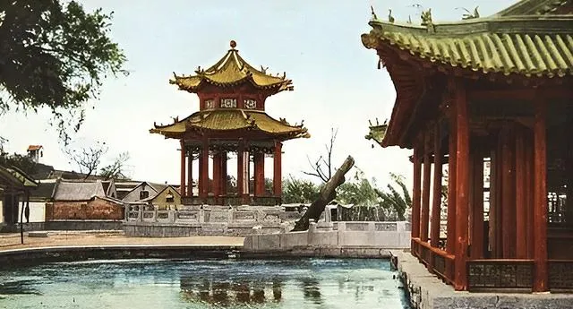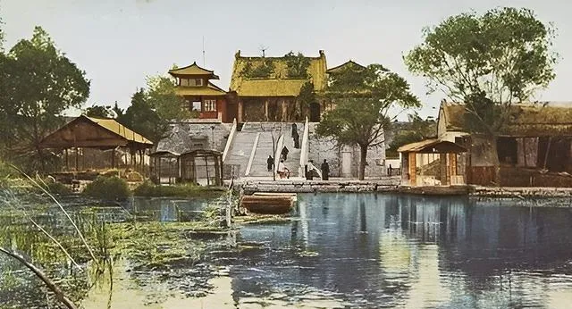 这个临水的庙宇叫北极庙,石台有三十多级,登上去风一扑脸,殿宇倒影稳稳落在水里,照片里能看见台阶上来来往往的人影,庙前水草萋萋,和现在的整饬不同,那时更有野趣。
