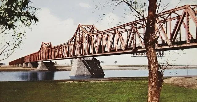 图中这座铁家伙叫泺口黄河铁路大桥,红色桁架连着一孔又一孔,墩台像钉子扎在河里,桥面上火车一过,铁声轰隆隆,爷爷说,那时候能站在岸边看一回车过桥,是一天里最热闹的事。