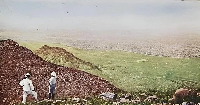 这张远眺图从山坡上拍下去,前景是碎石和草坡,往远看城市像一张铺开的灰毯,天边轻得发白,站在高处的人戴着白帽子,手搭凉棚看城,心里大概在数哪里是湖哪里是城门。