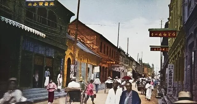 这幢正经八百的洋楼叫商埠会堂一带,立柱排成队,窗拱圆圆,电线杆和路边的招牌在镜头里挤成一团,街上车辙把土路划出槽,马车、人力车混在一起,声音嘈嘈却不乱。