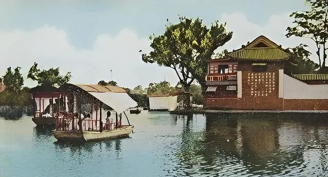 图中这条船叫画舫,船夫站在船尾抬手一撑,水面被篙子划开一条亮线,船舷上挂着对联,桌上放着茶盏,小时候第一次坐这种船,我爸小声说别乱动,小心把茶打翻,可我还是忍不住探头去看水里的鱼影。