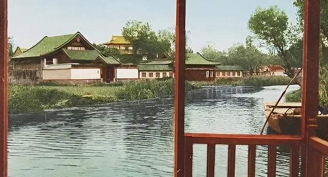 图中湖边的木屋叫湖岸茶棚,窗上挂着帘,门口晾着衣裳,水面慢吞吞,船在屋影里转了半圈才离开,那会儿的湖边生活气更浓,游人和居民搅在一起,白天是景,晚上就是家。