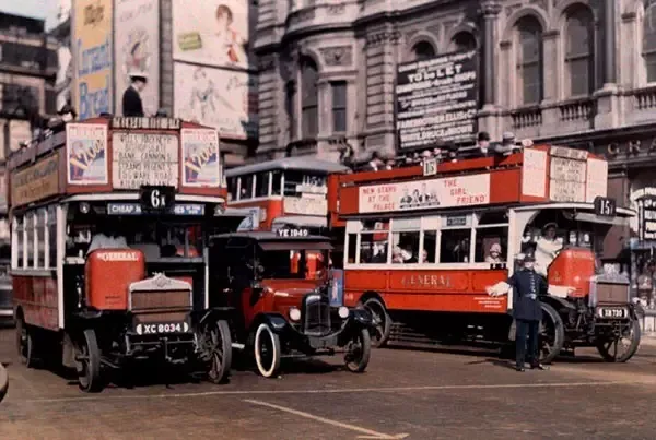 1928年,伦敦特拉法加广场,行驶中的红巴士。