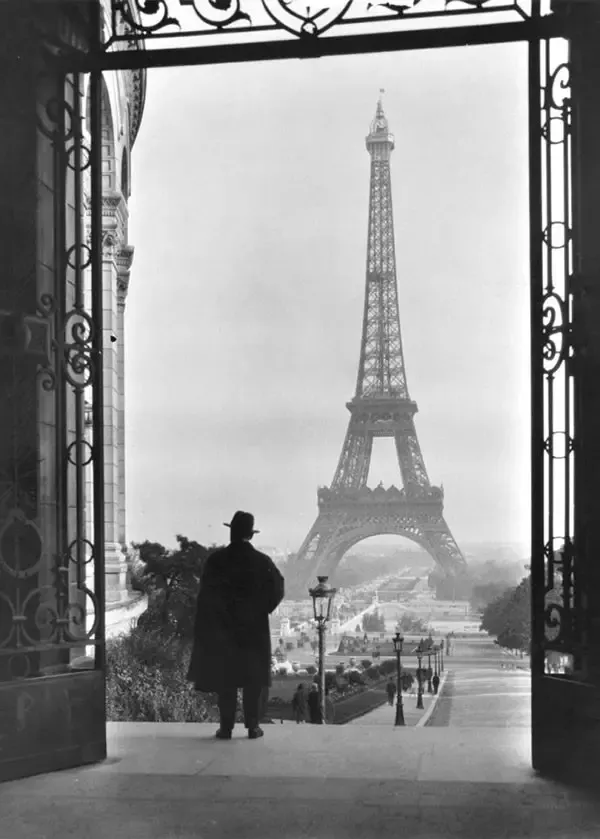 1929年,法国巴黎,看着埃菲尔铁塔的男人。