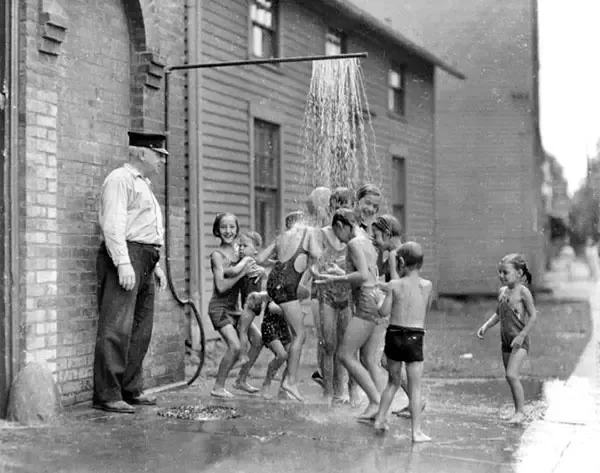 1935年4月,美国,儿童们在康涅狄格消防站外消暑。